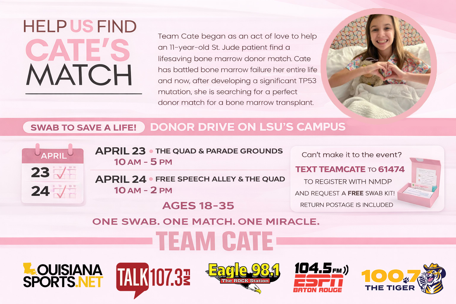 Team Cate is hosting a bone marrow donor drive at LSU in support of an incredible 11-year-old St. Jude patient bravely fighting bone marrow failure. Cate needs a match, and you could be the one who helps save her life.